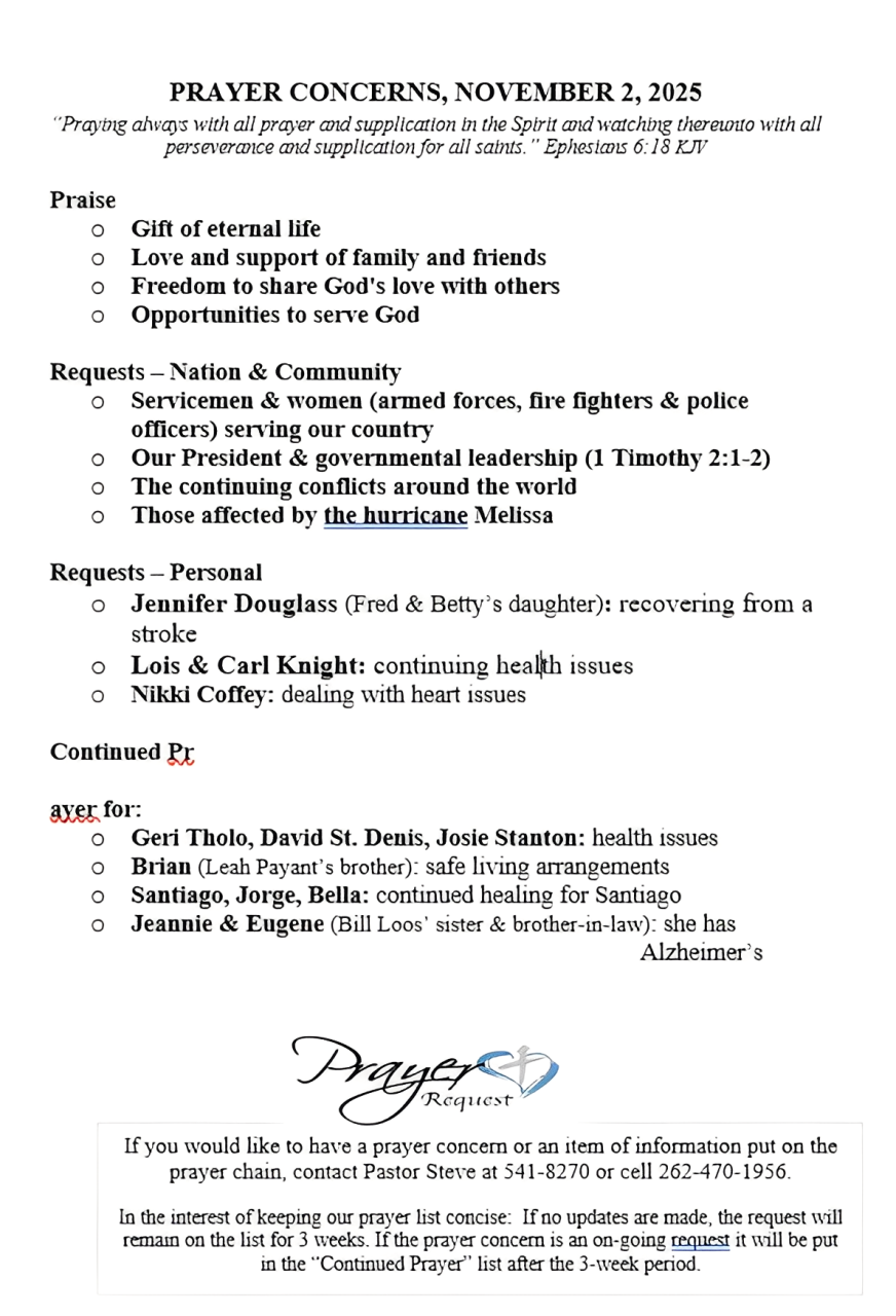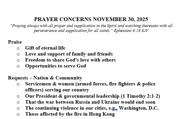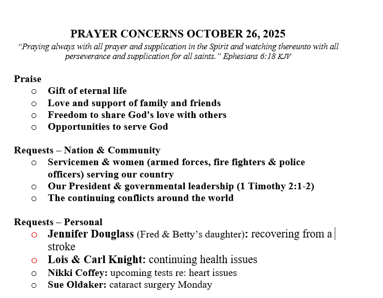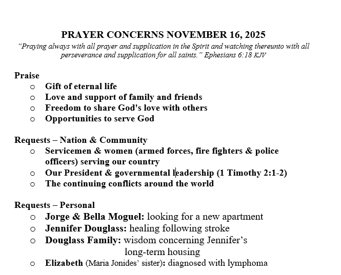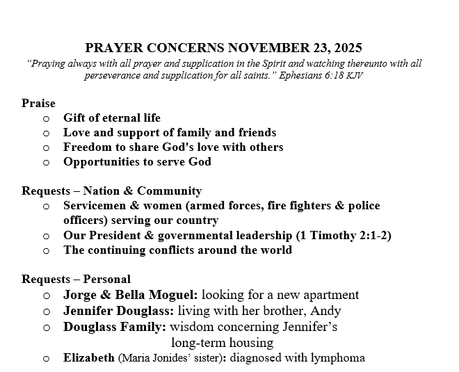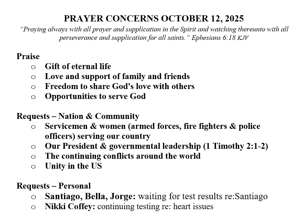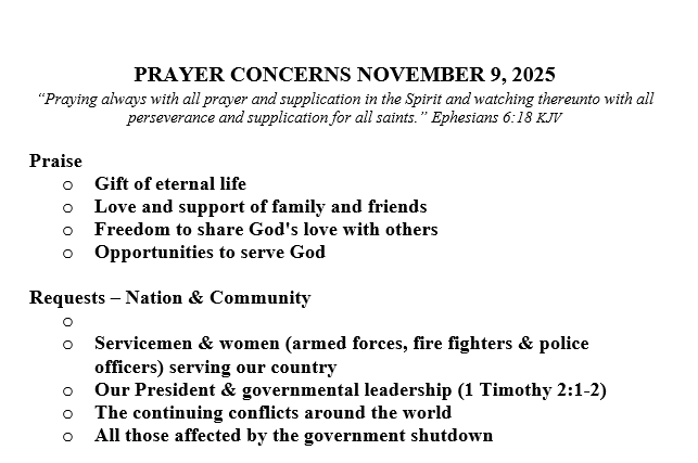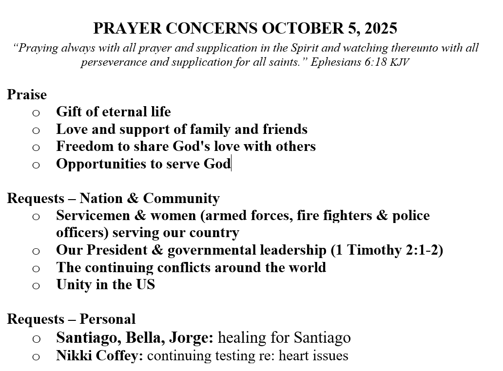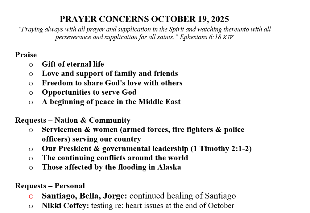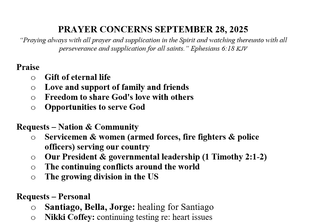 PRAYER CONCERNS SEPTEMBER 21, 2025